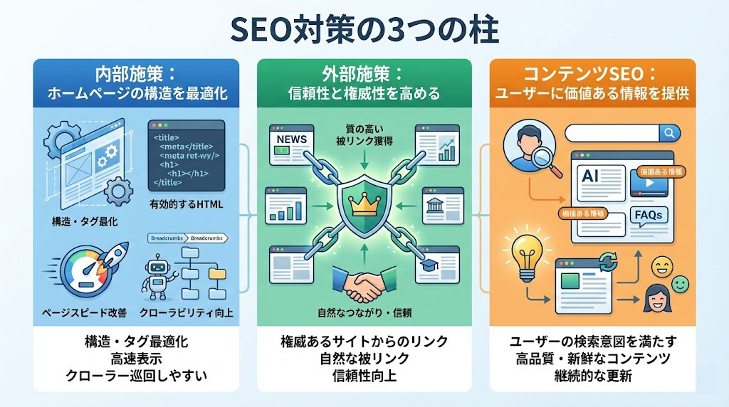 ホームページ運用におけるSEO対策は、継続的な取り組みが求められる重要な活動です。内部施策、外部施策、コンテンツSEOの3つの柱をバランスよく実践し、定期的な分析と改善を繰り返すことで、検索エンジンからの評価を高め、ビジネスの成果につなげることができます。